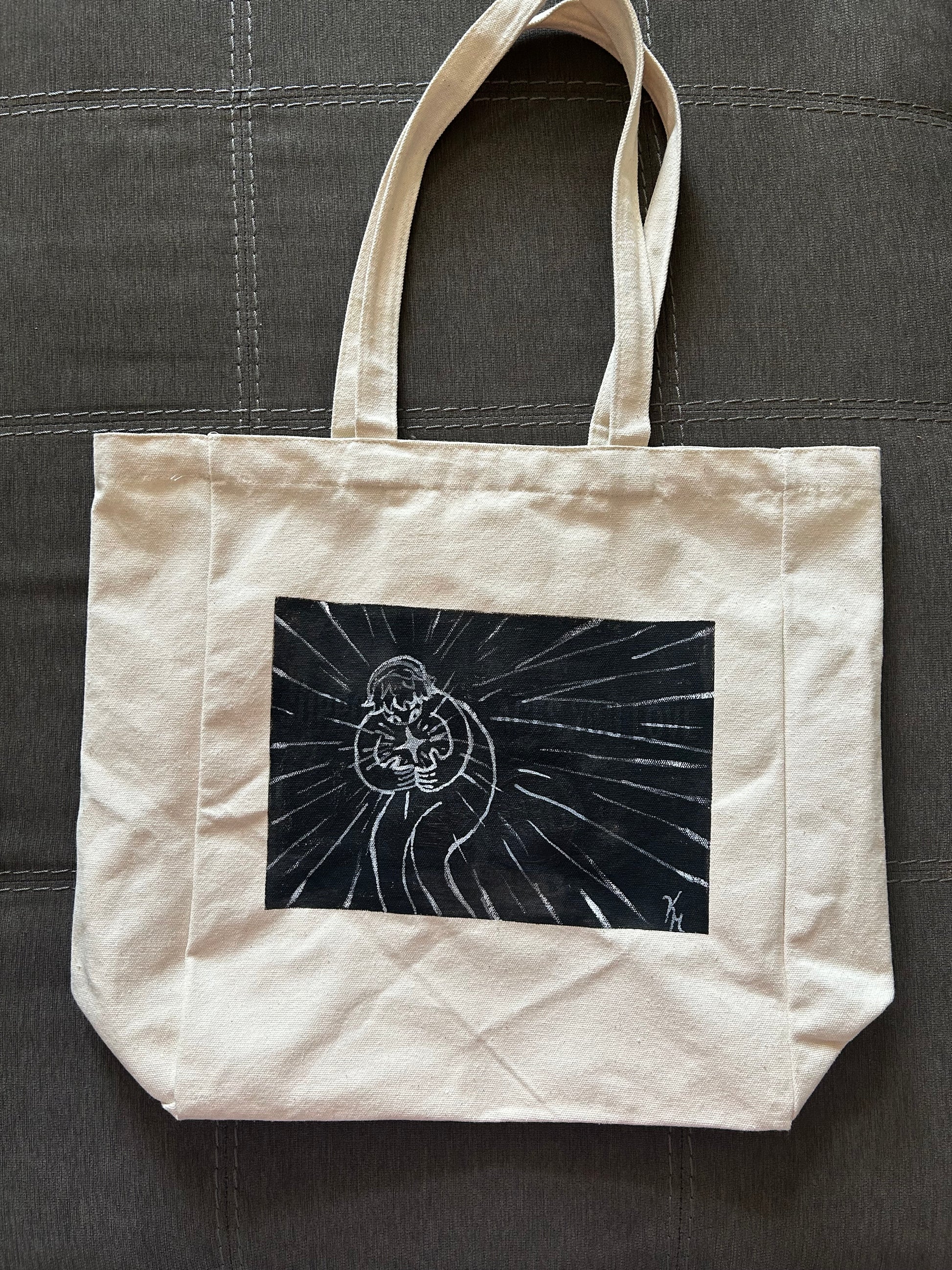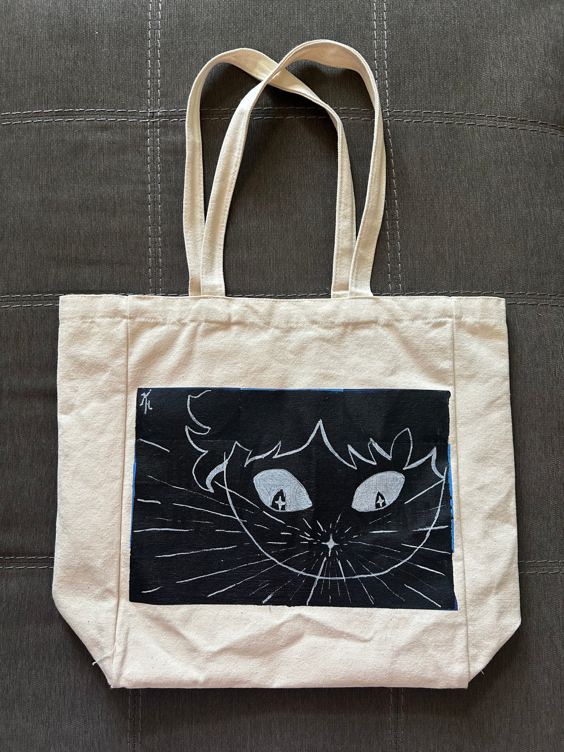 Sturdy large canvas tote bag with two hand painted sides by me. The bag is a reused merch bag so you can kinda see the logo underneath the paint a little bit. But in a cool way. There is a great small Velcro sealing pocket in side for small items.
